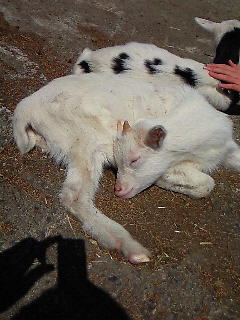 寝ているヤギと戯れる管理人(手)。(写真:兄貴)